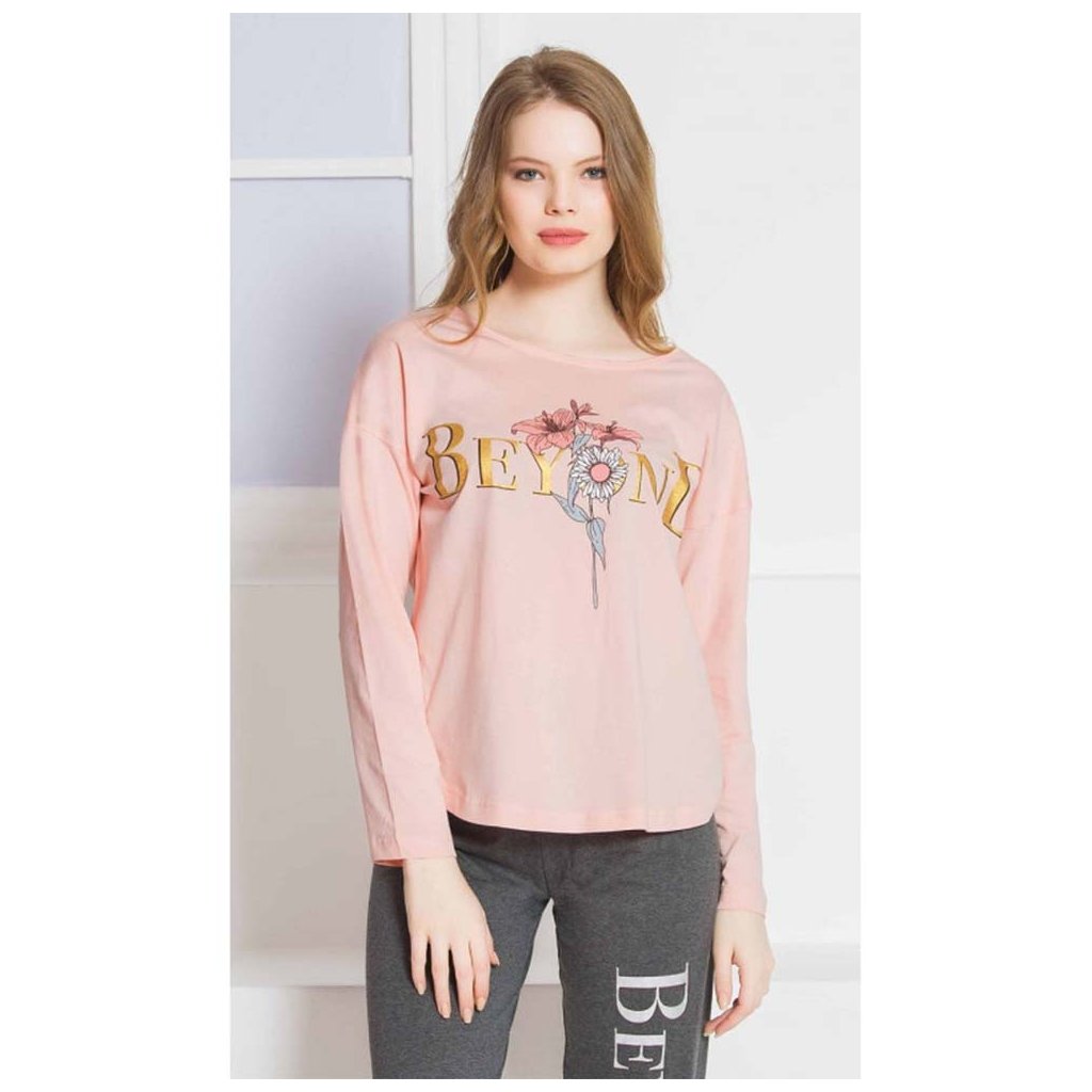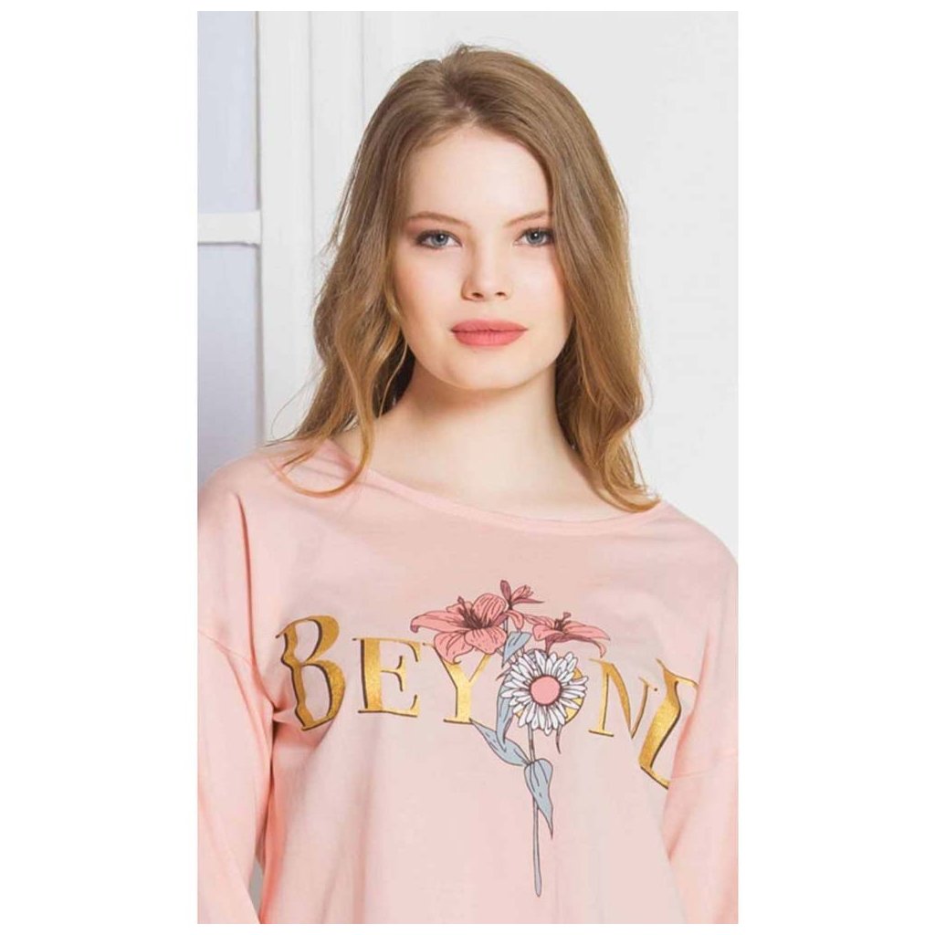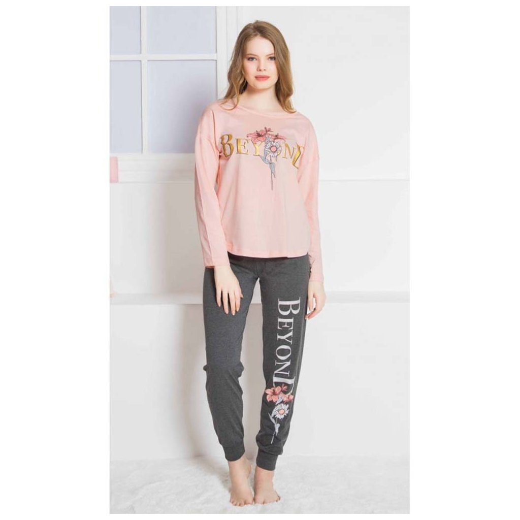 Dámské dlouhé pyžamo Beyond se skládá z trika s dlouhým rukávem a dlouhých kalhot. Tričko je zdobeno velkým zlatým nápisem „Beyond“ doplněným třemi květinami, které se opakují i na kalhotách zakončených pantem. Vyrobeno z jemného a poddajného materiálu 70% bavlna, 30% polyester, vhodné na spaní i denní nošení.