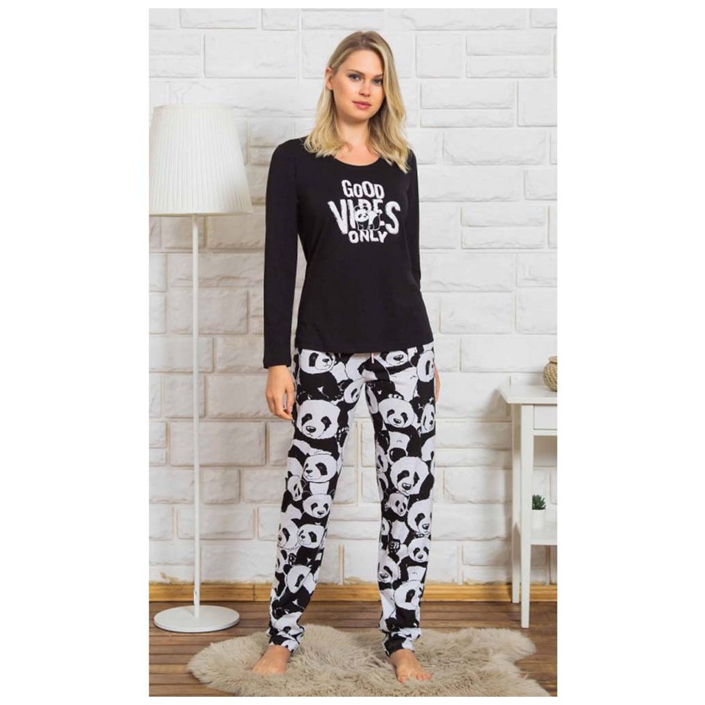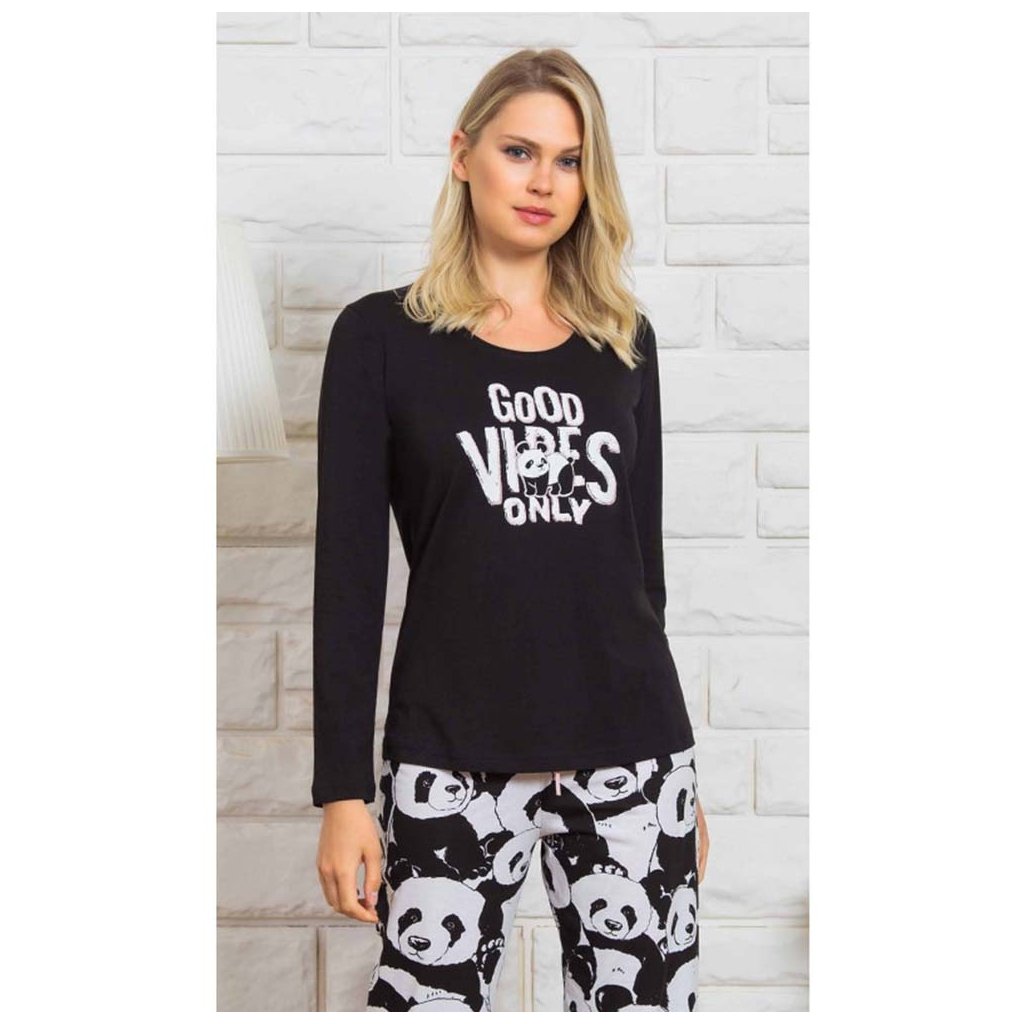 Dámské dlouhé pyžamo Good Vibes kombinuje pohodlí, styl a kvalitní materiál. Pyžamo se skládá z trička s dlouhým rukávem a dlouhých kalhot se šňůrkou v pase. Tričko zdobí nápis „Good Vibes only“ a obrázek roztomilé pandy, motiv se ve větším provedení opakuje i na kalhotách.
