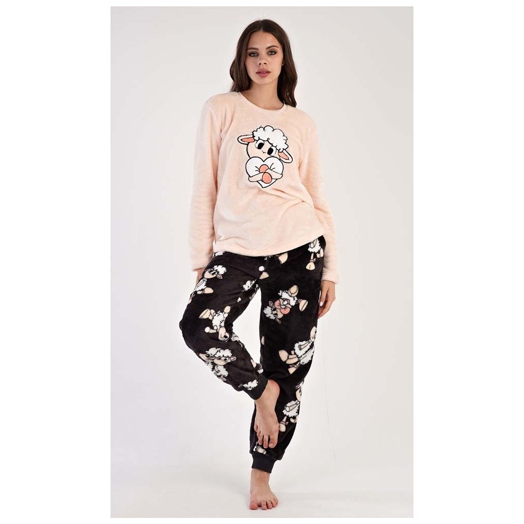 Dámské dlouhé pyžamo Olivia z hebkého softového materiálu je ideální pro chladné dny. Tričko s kulatým výstřihem zdobí aplikace ovečky se srdcem. Vzorované kalhoty mají gumu, šňůrku ke stažení, praktické kapsy a zakončení pantem.