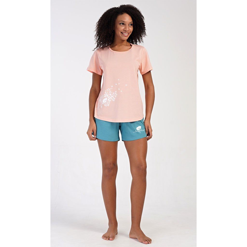 Jednobarevné tričko zdobí něžný motiv kotěte s rozfoukanou pampeliškou, který dodává pyžamu jemný a hravý vzhled. Motiv kotěte se opakuje i na šortkách, což vytváří sladěný a stylový komplet. Šortky mají elastický pas se šňůrkou na stažení pro pohodlné přizpůsobení postavě a jsou bez kapes.