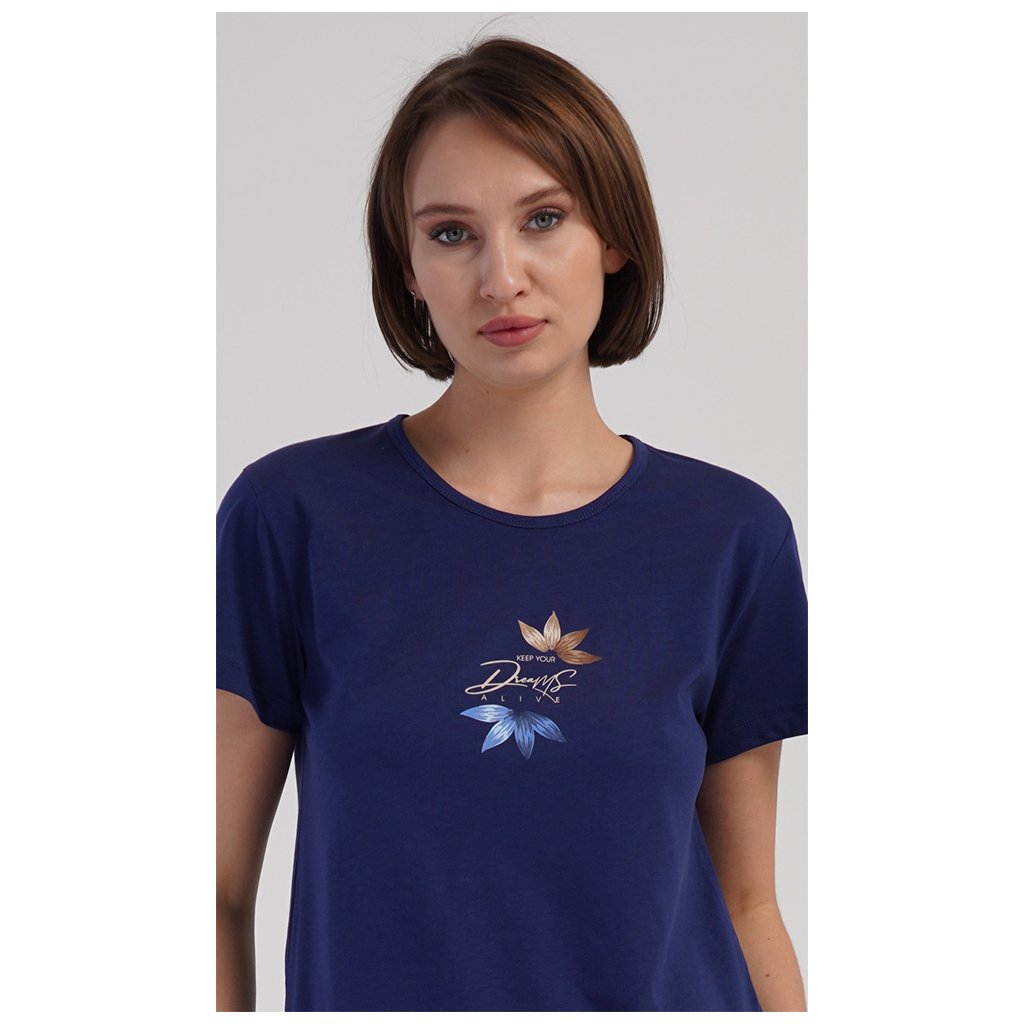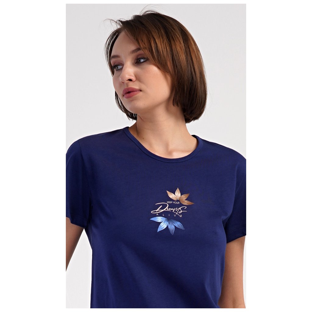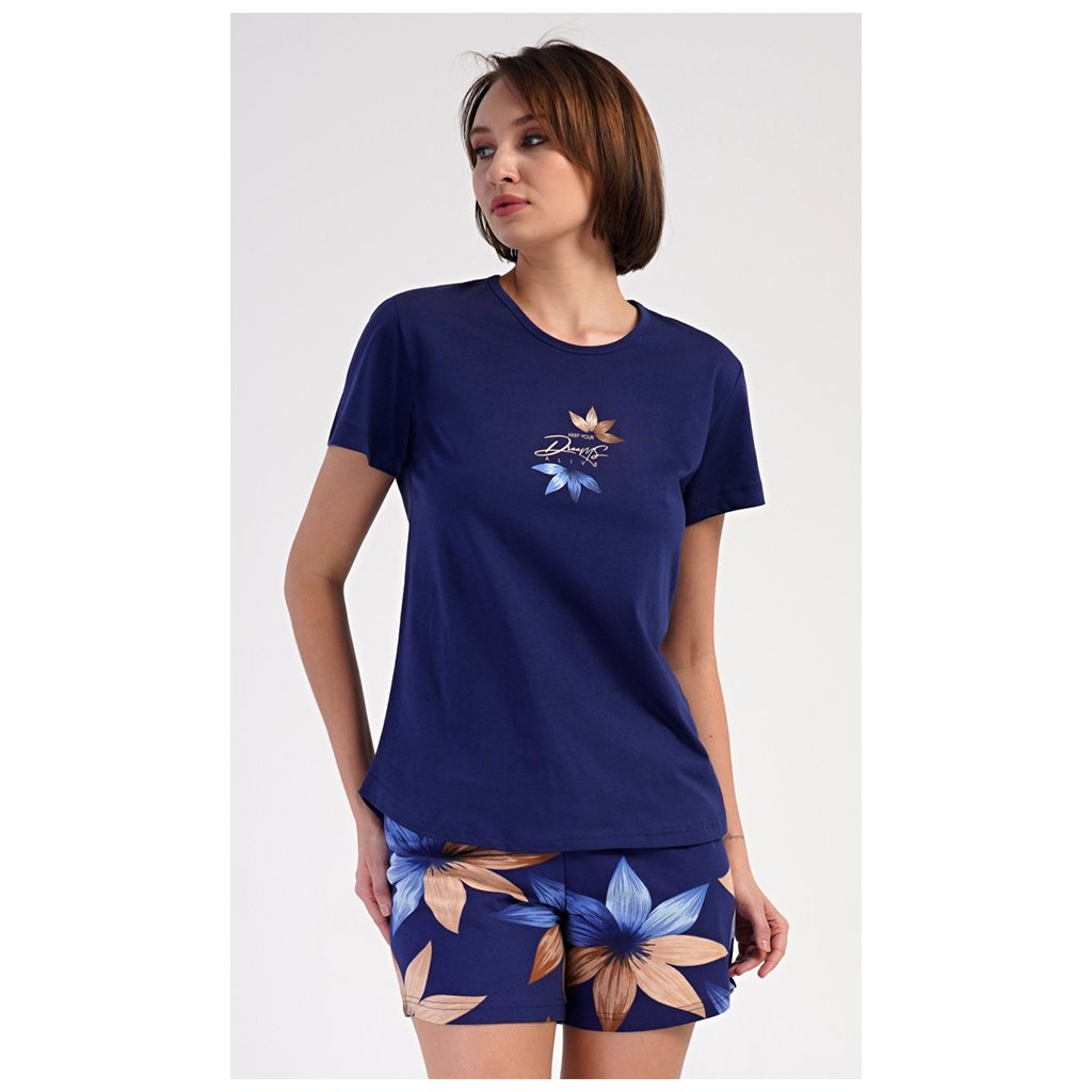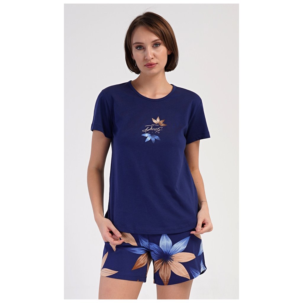 Dámské šortkové pyžamo Sára se skládá z trička s krátkým rukávem a šortek. Tričko je jednobarevné a zdobené květinovým motivem, který se opakuje i na šortkách s gumou a šňůrkou na stažení. Šortky nemají kapsy.