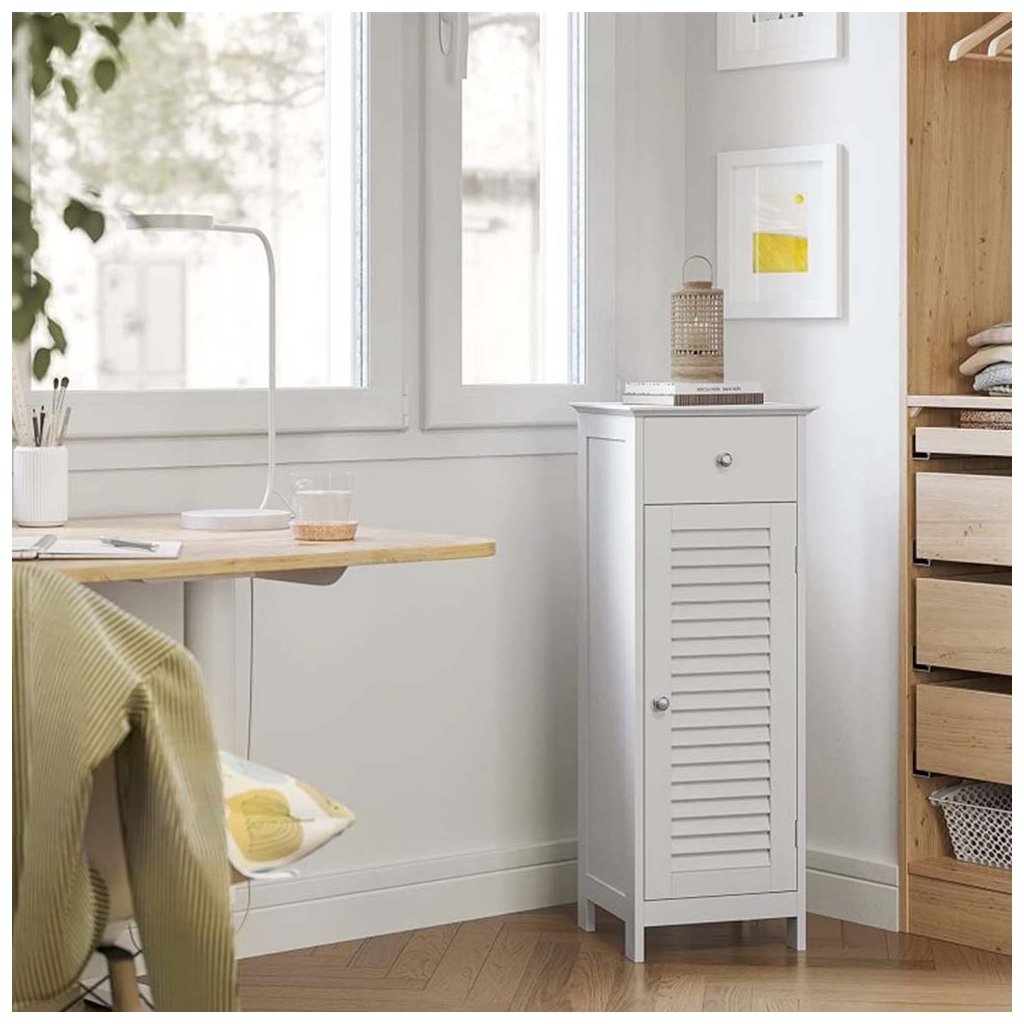Koupelnová skříňka se zásuvkou a dvířky z pevné dřevovláknité desky s dlouhou životností a odolností proti vlhkosti.
