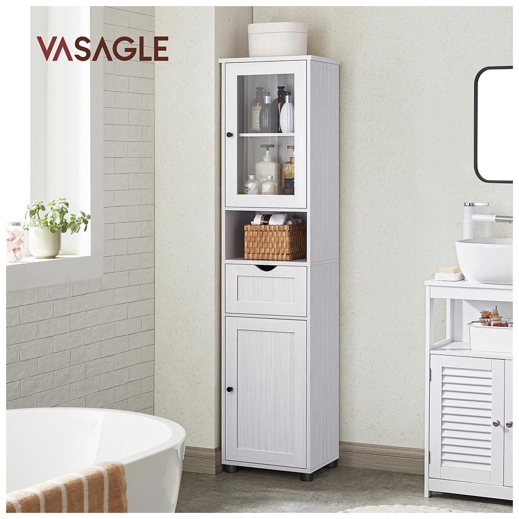 Sloupová koupelnová skříňka s nastavitelnými policemi.