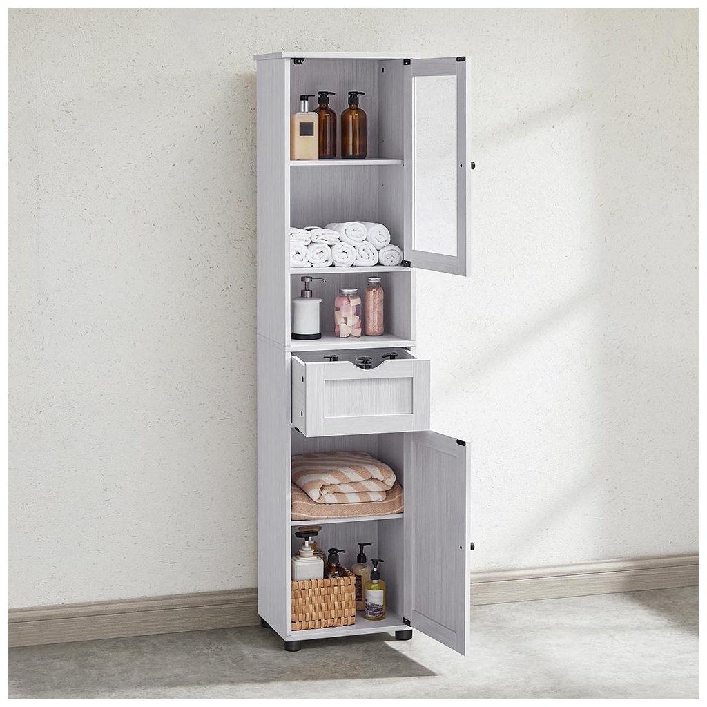 Skříňka nabízí otevřenou přihrádku na věci, které často používáte, zásuvku na ručníky a výškově nastavitelné police za dvířky pro uložení věcí různých velikostí.