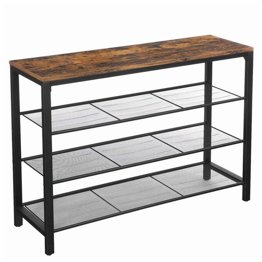 Matně černý kovový rám a vintage hnědý povrch tohoto botníku spolu perfektně ladí.