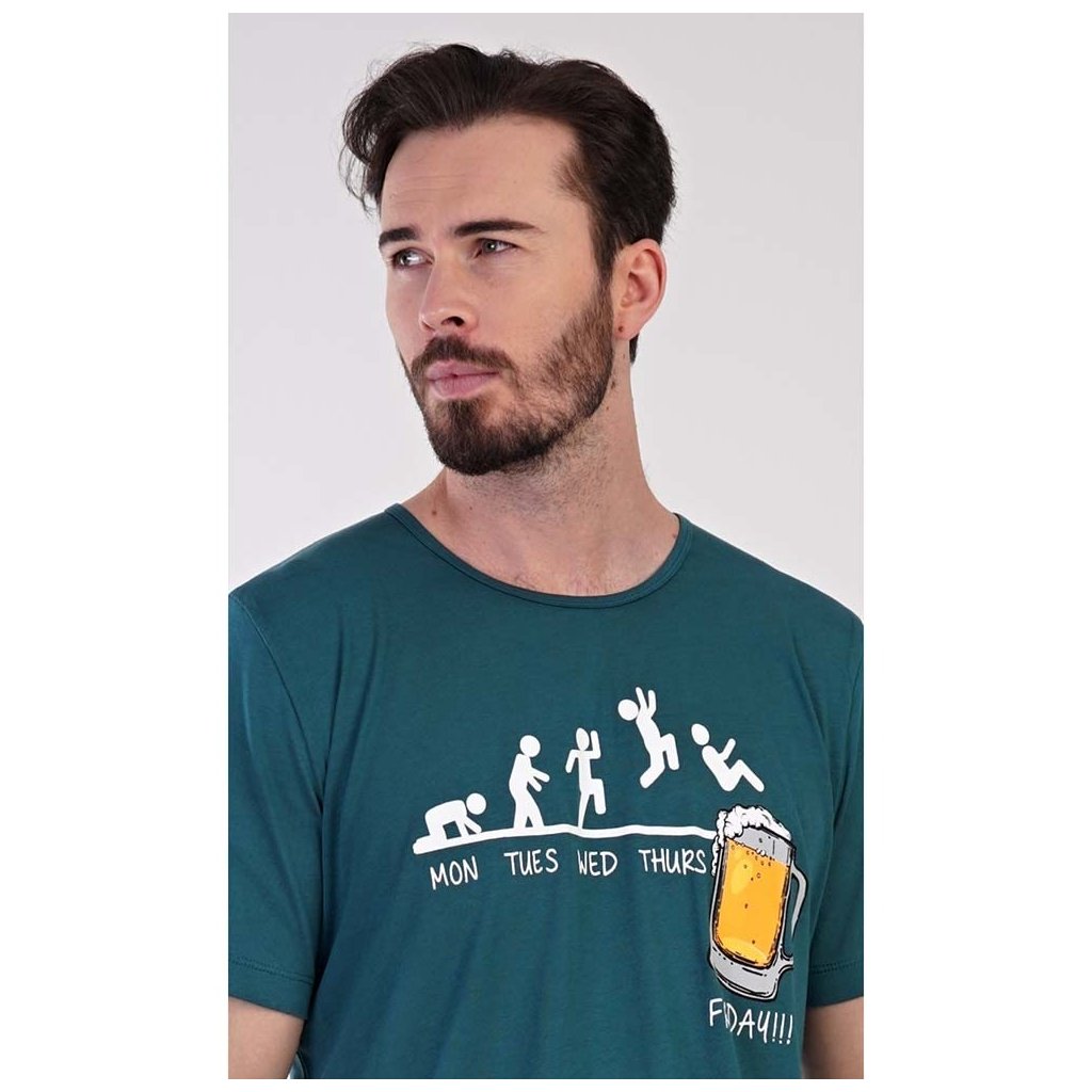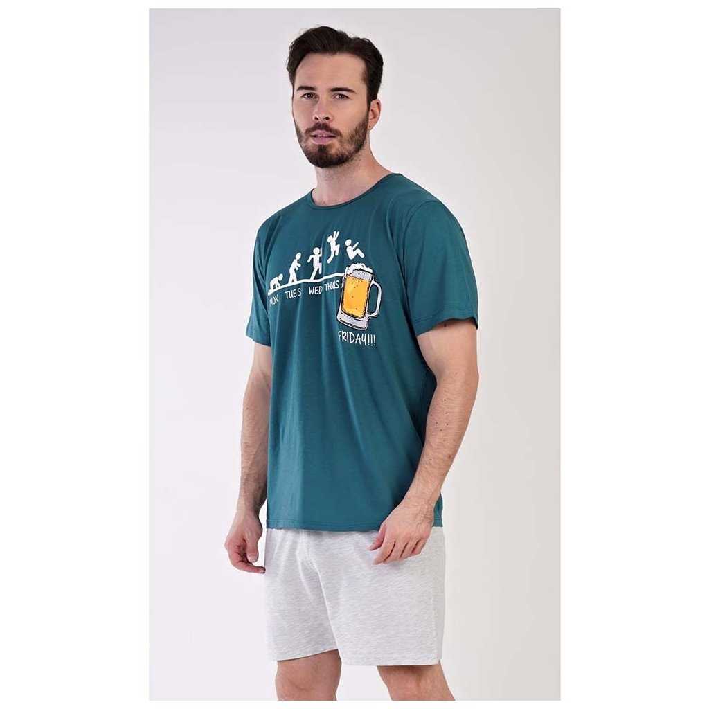 Dopřejte si pohodlí s pánským pyžamem Filip, které kombinuje hravý design s praktickým střihem. Pyžamo se skládá z trička s krátkým rukávem, zdobeného veselým potiskem panáčků, kteří se těší na víkend a sklenici piva, a jednobarevných šortek s gumou a šňůrkou ke stažení. Kalhoty nemají kapsy, což zajišťuje pohodlný střih.