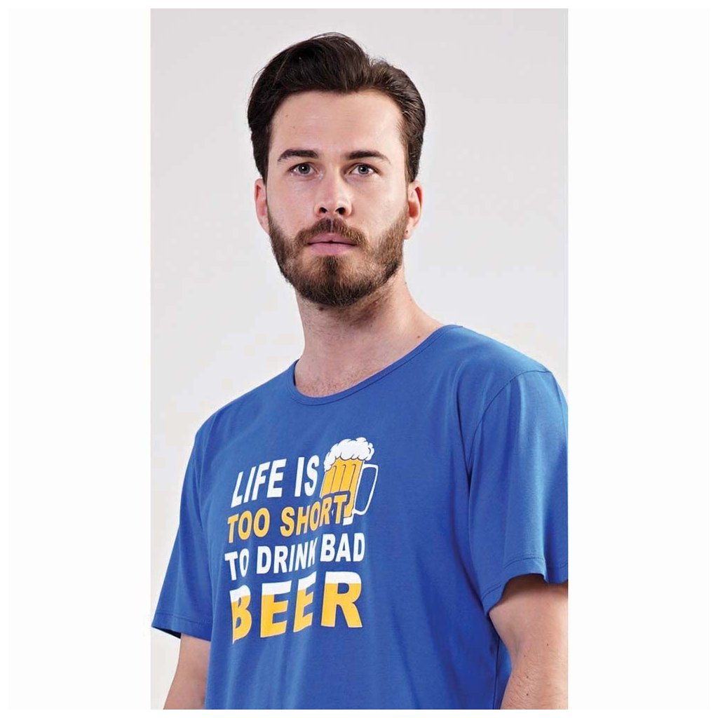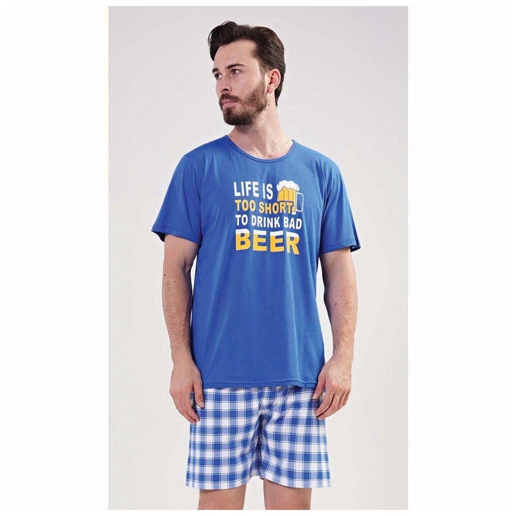 Pánské pyžamo nabízí pohodlí, styl a praktičnost, nyní i v nadměrných velikostech. Souprava se skládá z trička s krátkým rukávem, zdobeného anglickým nápisem s motivem piva, a krátkých kostkovaných šortek, které doplňují celkový vzhled pyžama.