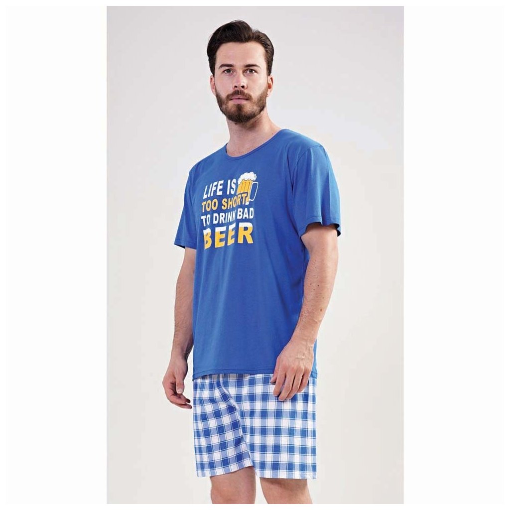 Pánské bavlněné pyžamo s tričkem s krátkým rukávem a anglickým nápisem s pivem a kostkovanými šortkami. Pohodlné, jemné a v nadměrných velikostech.