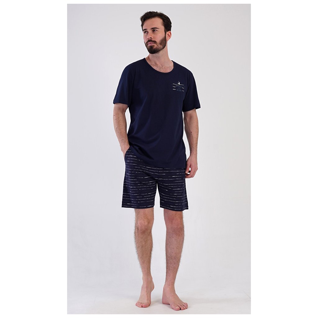 Pánské bavlněné pyžamo Surf and Sun s tričkem s krátkým rukávem a potiskem Surf and Sun a šortkami se zvlněnými proužky. Pohodlné a jemné na dotek.