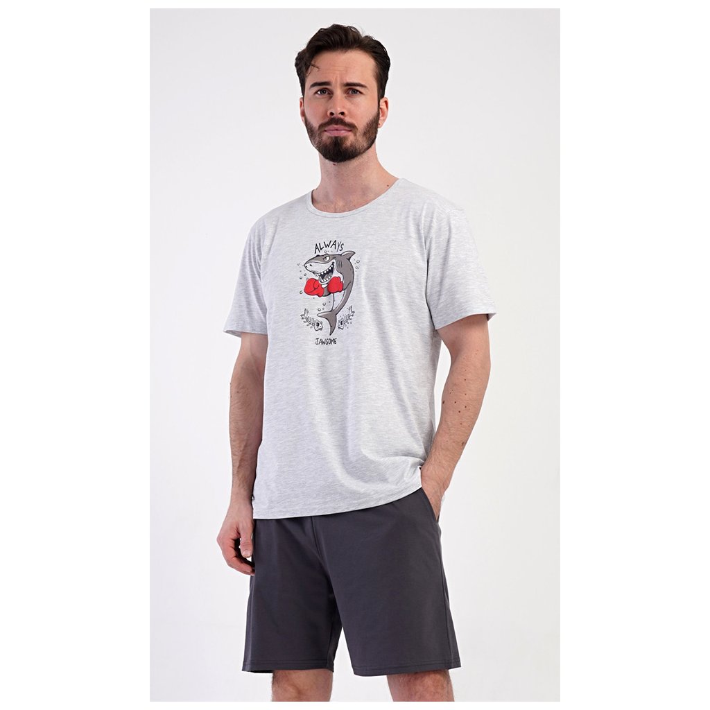 Pánské letní pyžamo Žralok s tričkem s krátkým rukávem a potiskem žraloka a šortkami s kapsami, gumou a šňůrkou v pase. Pohodlné a jemné na dotek.