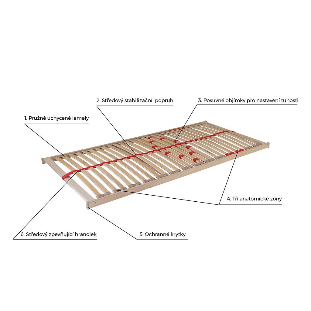 Skutečná velikost roštu je vždy o 1 cm užší a o 5 cm kratší než je uvedený standardní rozměr. Tím je zaručeno snadné a správné uložení roštu s matrací do rámu postele.