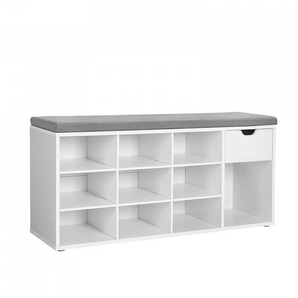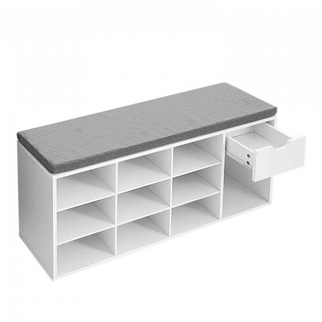 Botník a sedací lavice 10 přihrádek, zásuvka a polstrovaný sedák.